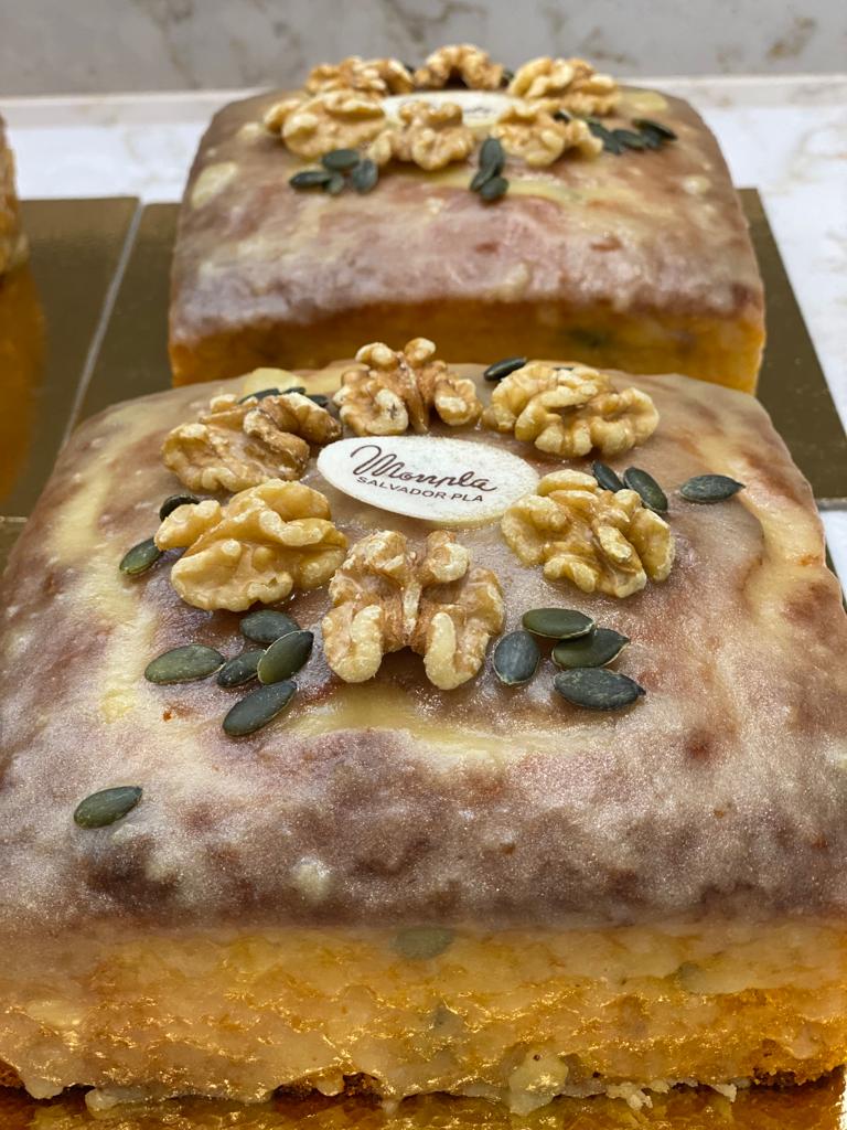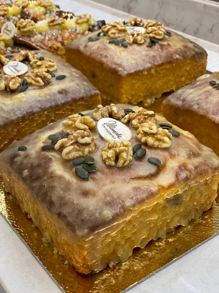 Ingredientes: huevos ,azúcar, calabaza asada , ralladura limón/naranja, aceite girasol, harina trigo , impulsor de masas , pistachos, avellanas y almendra .